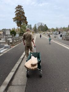 お塔婆は法要翌日に立てておきました。寺から徒歩圏内のお墓には、写真のようにキャリーワゴンに載せて子供たちと回らせていただきました。